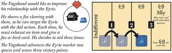 The Vagabond plays all sides of the conflict, making friends and enemies as suit his ends, while going on quests to increase his renown throughout the wood. As the Vagabond improves his relationships with other factions, or removes pieces of factions hostile toward him, he scores victory points.