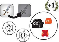 Undeterred, he exhausts his second sword to battle again. The Marquise doesn't play an ambush card. The Vagabond then rolls the dice, rolling a 2 and a 0. With only one undamaged sword, the Vagabond can only deal one hit. Because he removed a warrior of a Hostile faction, the Vagabond scores one point.
