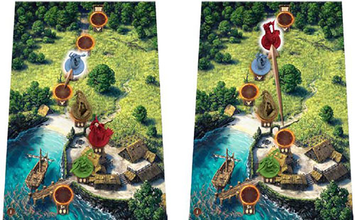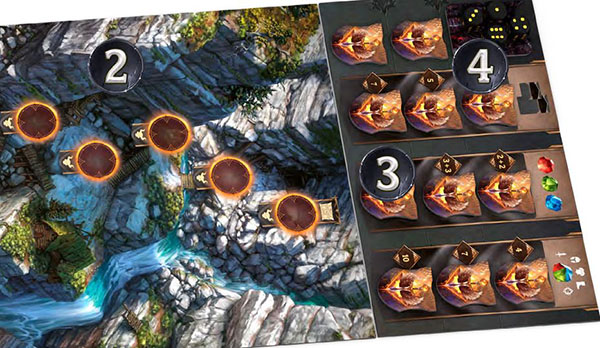 Two-player game: Three achievement spaces will not be used. In each level, choose a random space by rolling a die. Put the die in the corresponding space. Once you have blocked one space in each level, deal 8 achievement tiles to the remaining spaces. Then remove the dice you rolled. Return the 4 unused tiles to the box.