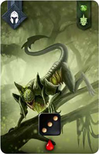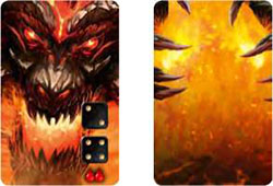 All the demon cards should have the demon face up. Sort them into three decks according to the demon icon in the upper right corner. Cards with the same number of dice will be in the same deck. Red, green, and blue cards will be mixed together. Shuffle each deck and place it on the hordes board.