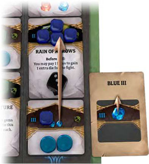 • After you Block, replace your dice with hit markers and take your dice back. You don't have to worry about cards you have already defeated, and hits on those that were not defeated will carry over into the next round.