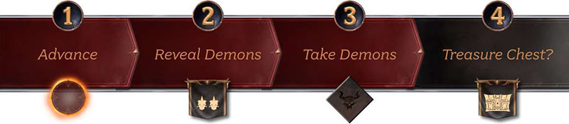 Players take turns. On your turn, you can move through the land, fight the demons who pursue you, or rest from your struggles. When you travel, you attract demons.