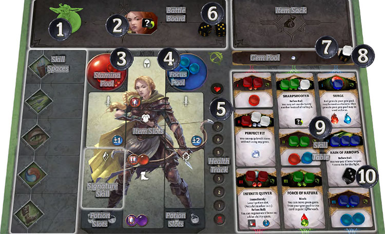 1. Take the nine skills belonging to your character. (Some are cards. Some are tiles).
