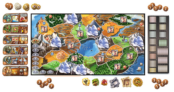 The map is divided into regions that you will conquer. At the end of your turn you will earn 1 Victory Coin for each region you control. The player with the most Victory Coins at the end of the game is the winner. There is a set number of turns to play also scaled to the number of players. In a 5 player game, you will get 8 turns and in a 2 player game you will get 10.