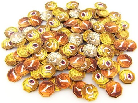Give each player five victory coins (of 1). Place all remaining coins, including all "3"s, "5"s and "10"s next to the board. These coins will serve as your currency during the game, and help determine the winner at the end.