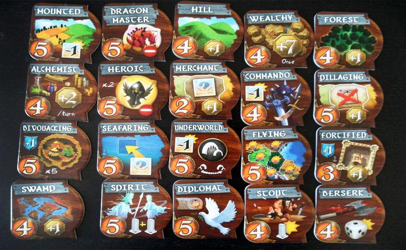 A race in decline is designated by flipping the tiles over to their black-and-white side. At the end each turn, you score one coin for each territory your races occupy. You can have one active race and one race in decline on the board at the same time. Your occupation total can vary depend on the special abilities of your race and the territories they occupy.
