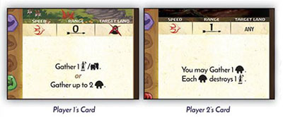 Example: Player I uses their Fast Power to target a land without Blight where they have Presence (because the range is 0) and Gathers I Explorer from an adjacent land into it.
