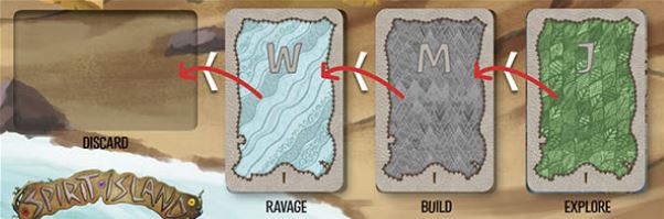 After Explore, slide all of the Invader Cards left: Move the Ravage Card to the discard, the Build Card to the Ravage Space, and the Explore Card to the Build Space, so that next turn they will Ravage where they Built this turn and Build where they Explored this turn.