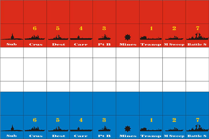 Stratego variant with a WWII Naval theme. All spaces are sea spaces, except for 2 islands in the center of the board. There are 40 new pieces.