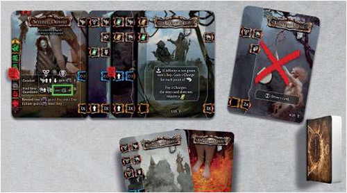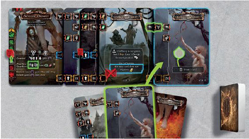 Together, Characters build a long line (Sequence) of cards, with the aim of pushing a marker on the Encounter card's Affinity track to the top. In the meantime, the opponent will push the marker in the opposite direction while performing various Responses.