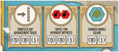 Achievements: There are 3 achievements on the board. When you earn each of them for the first time, place a player token on the highest available VP space under that achievement. You cannot lose achievements or earn the same achievement twice.