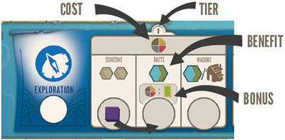 The benefit gained from upgrading a tech card to the middle row is shown in the circle (e.g., advance on the exploration track without gaining the benefit or the bonus).