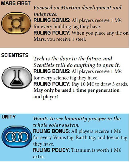 There are 6 different parties, each with a different one-time bonus and a policy (special effect or action), that are applied when they become ruling. To afford giving these bonuses to the players, the Terraforming Committee is also revising Terraform Ratings, causing players to lose 1 TR each generation!