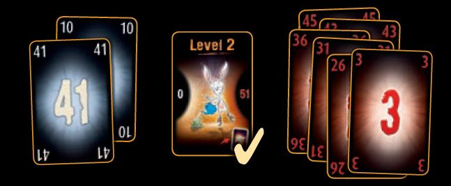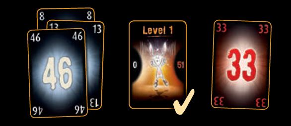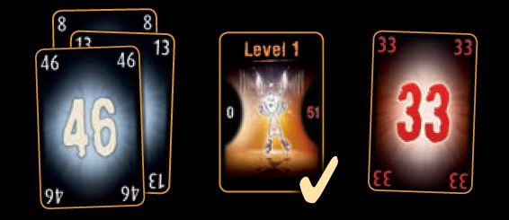 Example 1: Once the team has laid all cards in level 3, it turns the white cards over. The following were laid: 7-14-28-20-25-23-37-48. The cards 20, 23 and 25 should have been played before the 28. A life has to be given up for this mistake.