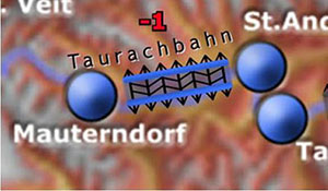 To make the destinations of the nine special tracks better visible, they are highlighted on the map with a black locomotive icon. Note that there are only eight locomotives. Bleiburg is the destination for two different Tourist Paths.