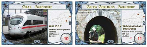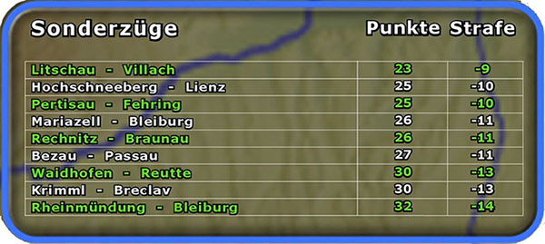 The corresponding points are marked in red on the game board. For example, minus eight points if a player builds the Feistritztalbahn, but cannot complete the rest of the Birkfeld - Pöchlarn Destination Ticket, or does not even have that Destination Ticket, by the end of the game.