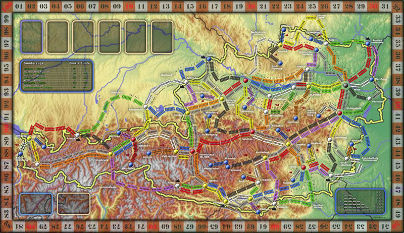 - Award 10 victory points to each player who establishes a continuous West-to-East path. That is, from Bregenz or Bludenz to either Breclav, Marchegg, Parndorg, Großpetersdorf, or Fehring.