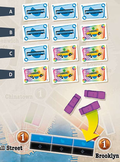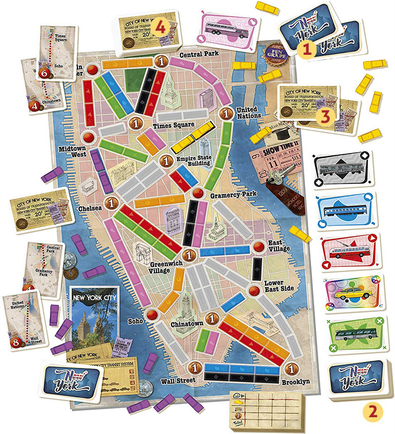 Place the board map in the center of the table. Each player takes a set of colored plastic Taxis.