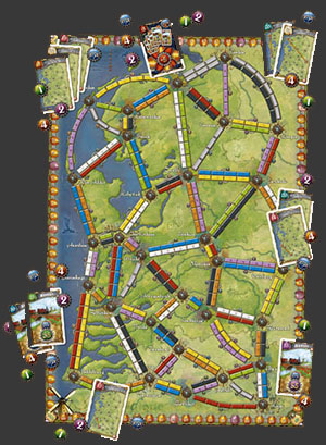 Er zijn 8 soorten gewone treinkaarten kaarten, plus locomotief kaarten en hun kleuren komen overeen met de verschillende routes tussen de steden op het bord.