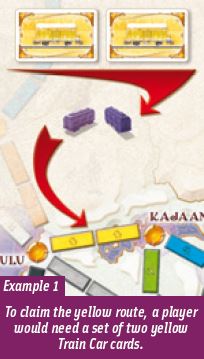 The player may claim a route on the board by playing a set of Train Car cards that match the color and length of the route and then placing one of his colored trains on each space of that route.