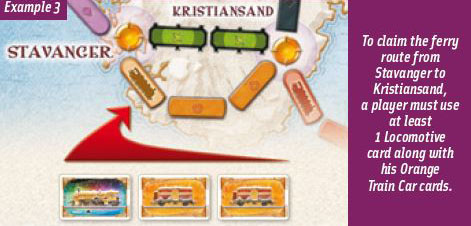 To claim a Ferry Route, a player must play a Locomotive card for each locomotive symbol on the route, and the usual set of cards of the proper color for the remaining spaces of that Ferry Route.