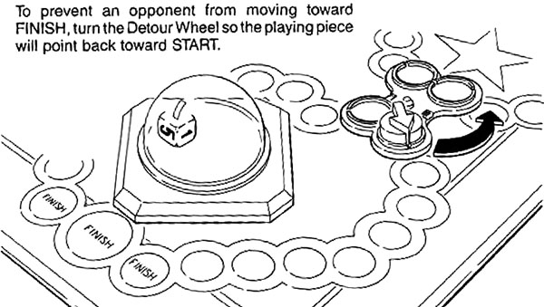Turn any ONE of the four Detour Wheels in any direction. This is an important option because you can improve your chances of reaching FINISH or keep an opponent from reaching FINISH. See example below: