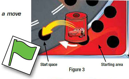 Select a character and put one of your cars on the Start space. Put the other three in your Starting area. (See Figure 3). If two players are racing, they should sit opposite each other, (e.g., green against red or yellow against blue).