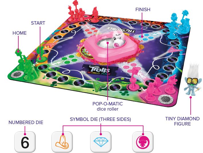 Your Trolls must go around the track once before landing on the FINISH spaces. Once there, your Trolls are safe-they cannot be sent back to HOME or swapped.