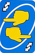 When you play this card, the direction of play reverses (if play is currently to the left, then play changes to the right, and vice versa). This card may only be played on a matching color or on another Reverse card.