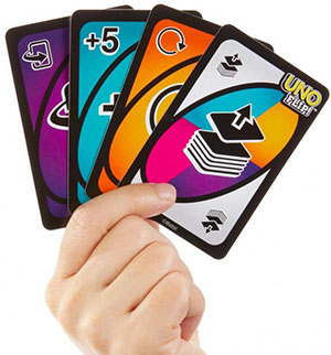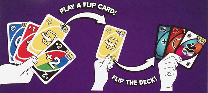 UNO FLIP plays like regular UNO, except there are two sides to the deck of cards: a "light" side and a "dark" side.
