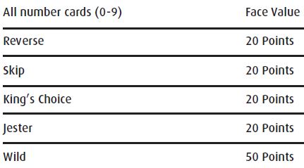 King's Choice Card - when this card is played, the King chooses any player he wants and that player must draw one card from the draw pile. This card may only be played on a matching color or on another +1 card (either King's Choice or Jester).