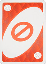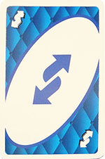 Reverse Card - When you play this card, the direction of play reverses (if play is currently to the left, then play changes to the right, and vice versa). This card may only be played on a matching color or on another Reverse card.