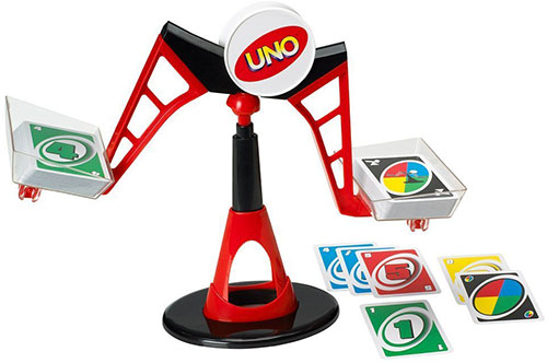 When you discard a card in one of the trays, if the scale tips so far that the cards are dumped out, you must draw 2 cards as a penalty! Even if it takes a while for the cards to spill out of a tray, the last player to make a play (discard or draw) takes the 2-card penalty.