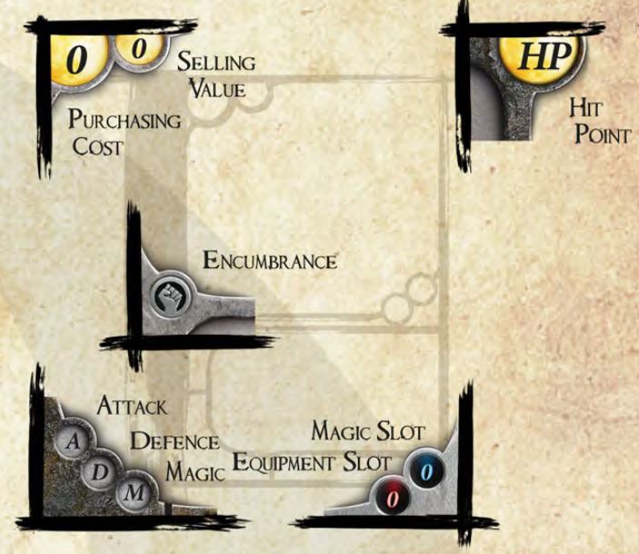Generally, the amulet and equipment cards occupy equipment slots (indicated in red) while spell cards occupy magic slots (indicated in blue). Heroes may be fitted with these cards until their available slots are occupied (the total number of equipment and magic slots available to each hero is indicated on the class card).