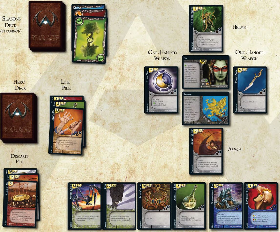 Warage is based on the clash of two or more heroes: a hero is created by choosing 1 race and 1 class card and can be equipped with weapons, armors, helms, spells and other items and abilites using the cards available in your hero deck.
