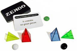 Zendo is a game of inductive logic in which the Master creates a rule and the Students attempt to discover it by building and studying small arrangements of Looney Pyramids.